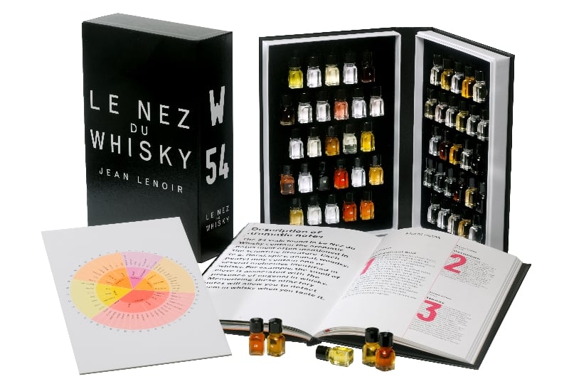 Le Nez du Whisky was developed by Jean Lenoir in collaboration with Scotch Whisky Masters (Masters of Quaich) Sean MacLean and Martine Nouet. The Le Nez du Whisky is designed to train oneself into recognizing the 54 most commonly found aromas in whisky/whiskey. Like the Le Nez du Vin (Le Nez du Whisky’s counterpart for wine aromas training), this whisky aromas kit comes in a gorgeous case containing 54 Aroma Vials and the 143-page Le Nez du Whisky Instructional Book.